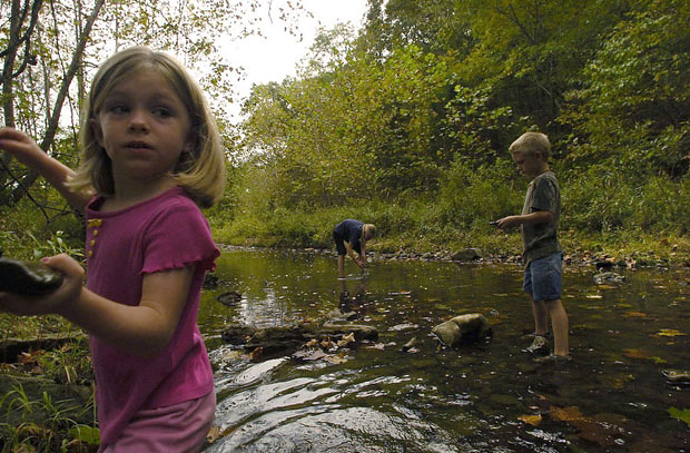 The search is on for fishing bait in the creek down the road. Anne, 6, comes forward with her find, while Angela and William keep looking.