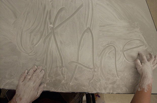 Kane writes his name on his desk in shaving cream after an exercise to draw shapes.