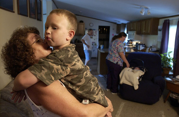 Edna Littrell holds her grandson before carrying him to the car. Edna watches Kane for a couple of hours after school while waiting for his parents to come home from work.