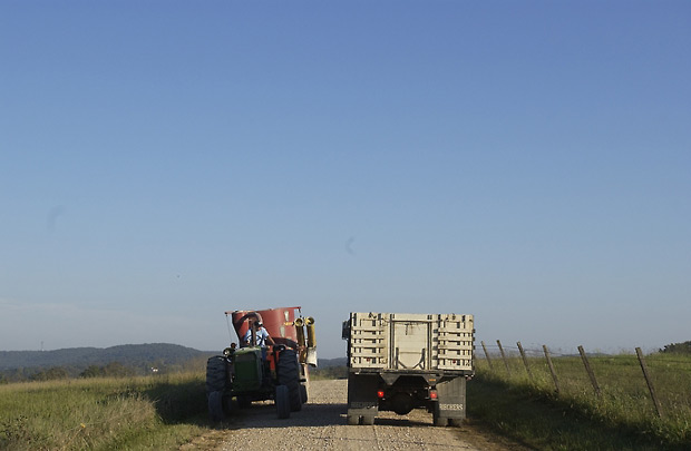Marvin & Martin Rohlfing Road runs through the center of the Rohlfing family way of life in Hermann, Missouri. David Rohlfing, left, stops to talk with his uncle, Marvin Rohlfing, before the day's harvest begins. David and his son Kevin symbolize the future of farming on the family road. [12 of 12]