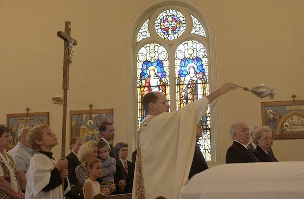 Father Bill Father Bill swings a thurible filled with incense over the casket of Leslie Franklin during his funeral in Rhineland. "We are reverencing the body," the priest says, "The symbolism is that when smoke rises, it's like our prayers rising to heaven." [12 of 13]