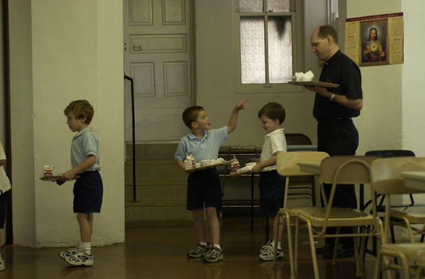 "Don't forget to clean off your tray," kindergartner Andrew Budnik of St. George School tells Father Bill as the students line up after lunch.