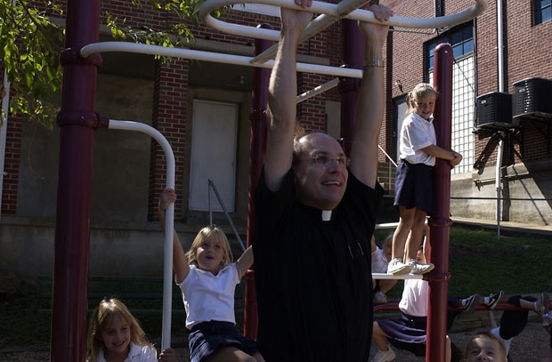 Kindergartners surround the 42-year-old priest as he climbs the monkey bars during the students' recess. "I was the class clown," says the priest, who grew up in a small, rural town about 35 miles north of Hermann.