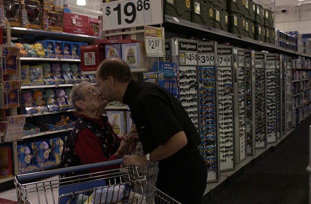 Father Bill Marjorie Wehmeyer, 82, of Gasconade greets Father Bill with a kiss at the Wal-Mart Supercenter in Washington, Mo. Wehmeyer and the priest met at a beauty shop in Hermann. "I was getting my haircut and he was getting his," Wehmeyer says. [9 of 13]