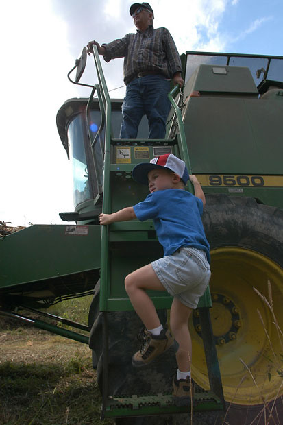 Dollars and Sense With almost 150 years of farming the land across the river from Hermann Missouri, Melvin Jacob stands atop his combine while one of his twin grandsons' Colter Scheible climbs down. This was the last opportunity for the grandsons to ride on the combine as the corn harvest was completed. [1 of 9]