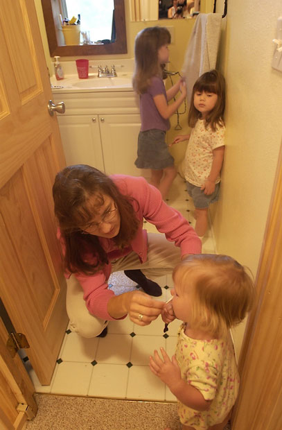 The morning routine consists of Sandra brushing Heidi's teeth while Haley and Heather prepare for the school day. Sandra's calm personality helps maintain order when the morning activities becoming too chaotic.