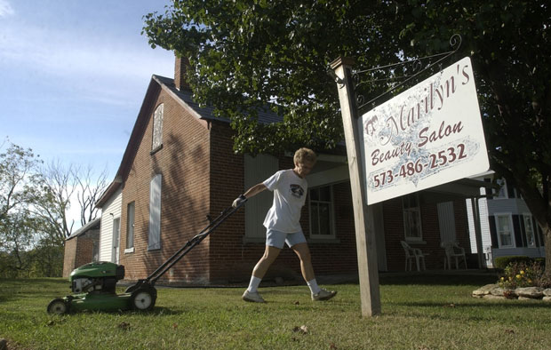 Fifty-seven-year-old Marilyn Overkamp mows the lawn in front of her beauty salon every Wednesday evening.