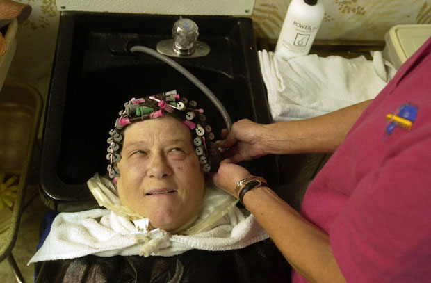 Long time customer Pat Dufner has the perm solution rinsed from her hair by Overkamp. "I do it because it makes people feel good," says Overkamp.