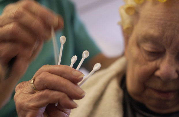 Customer Emma Gumper holds up pins for Marilyn as she applies curlers at the Hermann Area District Hospital. Overkamp makes a trip to the hospital every two weeks to style the hair of elderly patients.