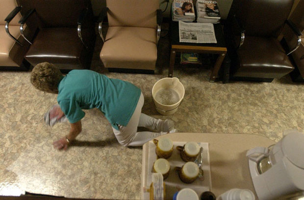 After another long day Marilyn scrubs down the floor of the salon.
