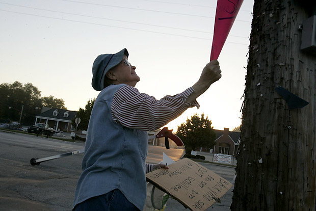 Ann pulls down an outdated yard sale poster on Market Street, Hermann’s main drag. A serial yard-saler, Ann knows the confusion old signs cause and does her part to keep things clear.