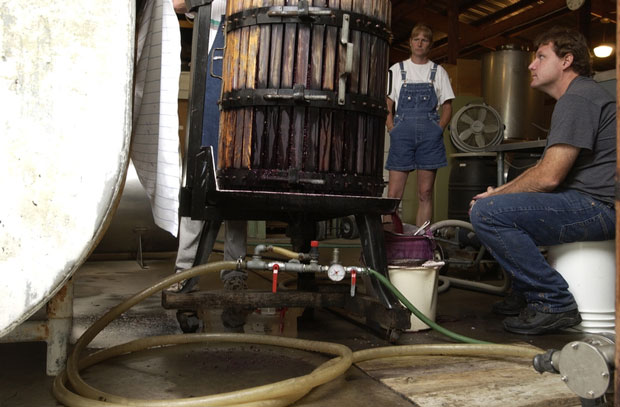Owners Carol and Kirk Grass examine the bladder press, used to separate juice from grape skins. Next year's business depends on the juice being pressed this fall.