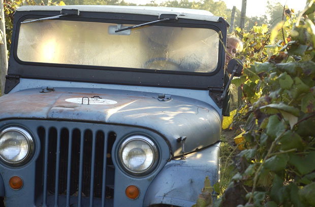 Carol Grass navigates the narrow rows in the vineyard. The morning condensation and broken wipers make it impossible to see through the windshield.