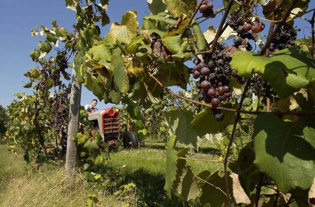 Vineyard employee Josh Voelkl mows the grass between rows of grapevines before the beginning of the harvest.