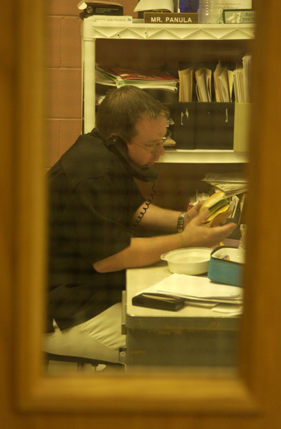 TJ Panula TJ Panula eats lunch in his office instead of the cafeteria, where many of his colleagues eat. After conducting high school bands and teaching music lessons in the morning, he has to rush to middle school classes every day at 12:22. [7 of 11]